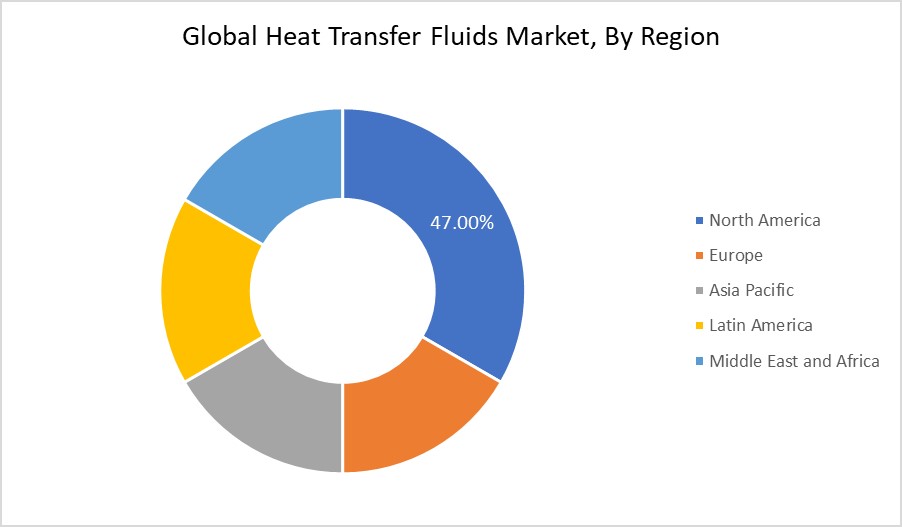 North America is projected to hold the largest share of the heat transfer fluids market over the forecast period because there are several manufacturers in the area. Demand for the product has also increased due to strict laws on carbon emissions and ongoing R&D efforts for novel and creative solutions. Demand for HTFs has increased due to continual product advancements and the adoption of strict restrictions. Production is anticipated to increase throughout the forecast period due to the availability of base stock, one of the key raw materials. On the other hand, the Asia Pacific heat transfer fluids market is anticipated to grow significantly because of rising demand from nations like China, India, and Japan. Due to its active efforts in energy-saving technology, China currently holds the highest stake in this region. The importance of heat transfer fluid has increased as a result of quick industrialization and advances in equipment in nations like South Korea and India.
